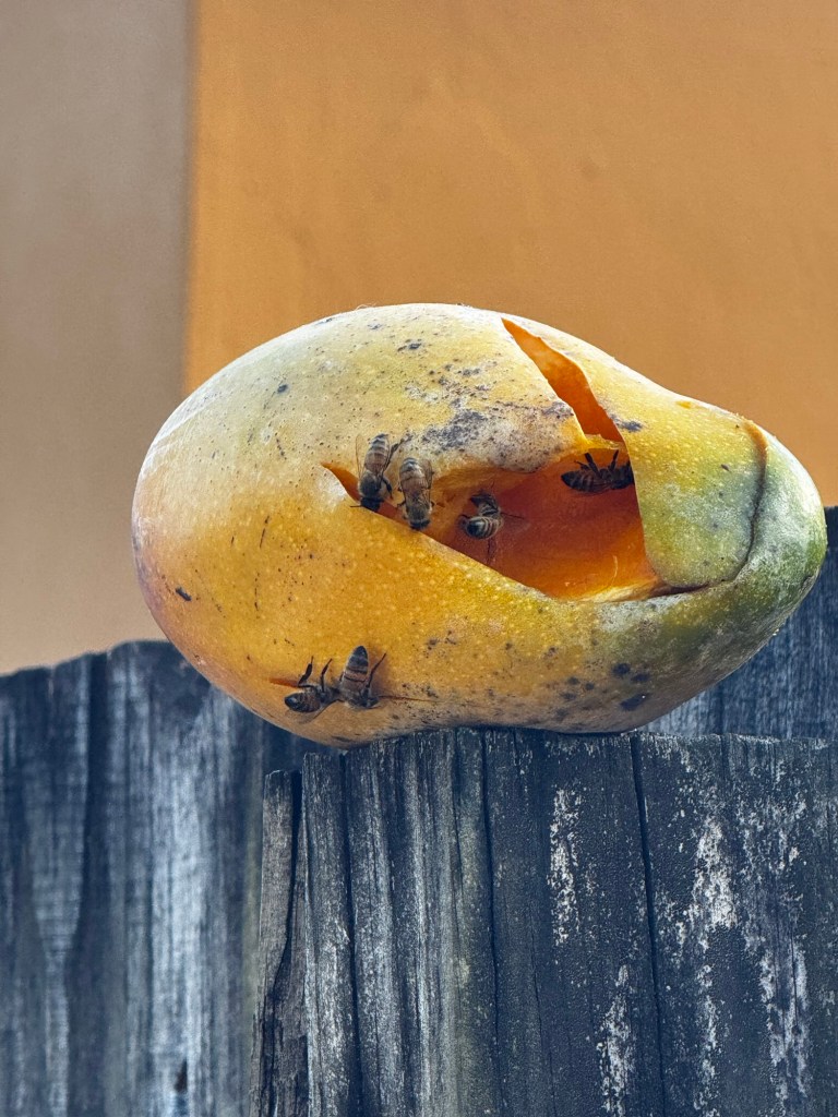 Because in true urban chaotic cottage fashion, we didn’t just sit around hoping the bees would show up—we bribed them. With mangoes. Lots of mangoes. Juicy, sun-soaked, sweet Miami mangoes lovingly (read: desperately) placed on our fence posts like fruity little altars to the Pollinator Gods.